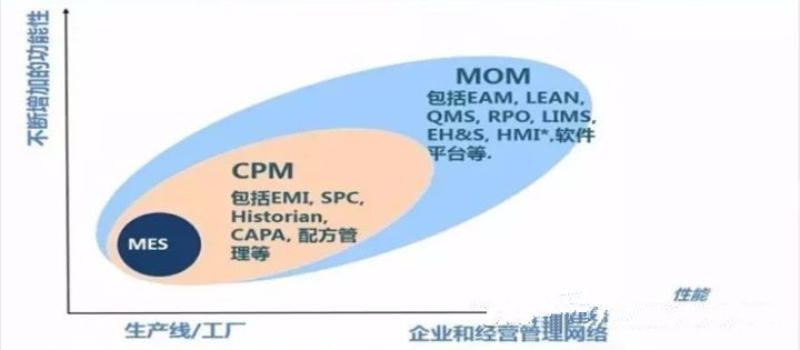 MOM系统覆盖的范围是企业制造运行区域内的全部活动,是一个抽象化了的,并且相对固定的区域;MES涉及的范围则会因其产品的设计理念、发展历程,以及应用的行业、地域的不同而变化,难以给出一个十分明确的界限,这就使MES和其他管理与控制系统之间的边界往往很难清晰地界定,各个软件产品间、功能模块间常常存在较多的重叠,交互关系也很不清晰,使得不同厂商的MES产品难以有效地实现集成与共享。MOM的提出避免了MES边界的争论,提供了一个更为广义并抽象化了的边界范围和一个更为明确的统一框架。